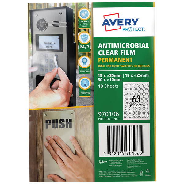 AVERY PROTECT ANTI MICROBIAL PERMANENT FILM MIXED CIRCLES 63UP A4 PACK 10