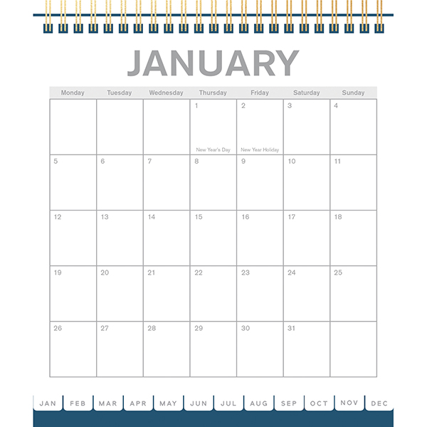 210x175mm. Month to view. Top opening with gold wiro. Flexible, printed board cover. FSC Certified.