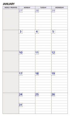 Monthly Dated refill pages for the Debden Dayplanner Personal Edition.Punched to fit 6 ring mechanisms