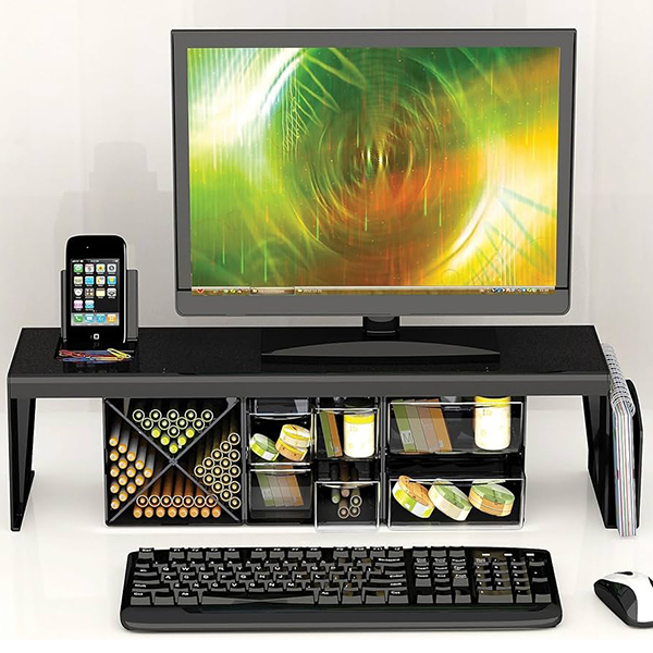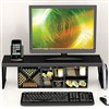 Save space and keep your desk organised with this smart, simple office desk shelf, which is also suitable for use as a monitor stand. Sturdy and features non-skid foam pads to ensure your monitor or items are secure. Includes a handy phone holder and file organiser. Holds up to 6.8kg, measures 655L x 225W x 212H. Made from a minimum of 30% recycled plastic. Available in black only. (pictured accessories not included).