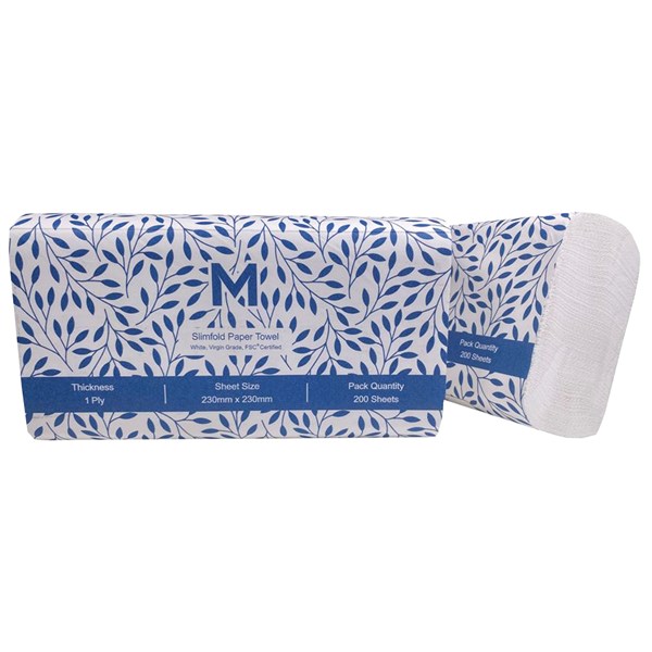 MPH SLIMFOLD PAPER TOWEL WHITE 1 PLY PACK 200 SHEETS 230X230MM CARTON 20 PACKS