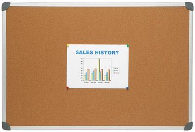 A lightweight, anodized aluminium frame surrounds this traditional natural cork bulletin board. The self-healing cork surface hides pin holes, and the board is designed to resist moisture absorption and warping for long life