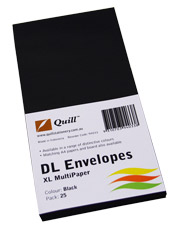 QUILL DL COLOURED ENVELOPES PLAINFACE STRIP SEAL 80GSM 110 X 220MM BLACK PACK 25